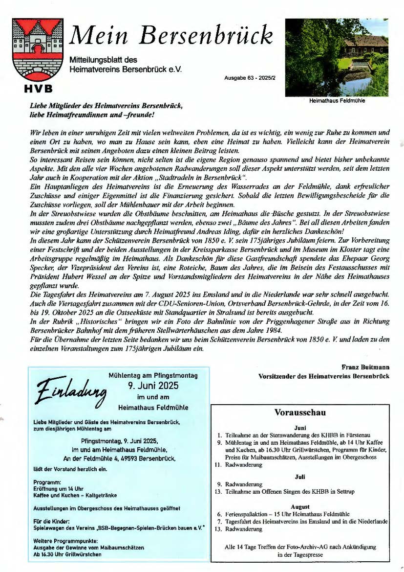 Unter dem Motto „Mein Bersenbrück – Gestern und Heute“ hat der Heimatverein Bersenbrück auch für das Jahr 2026 wieder einen Heimatkalender herausgegeben. Unter dem Motto „Mein Bersenbrück – Gestern und Heute“ hat der Heimatverein Bersenbrück auch für das Jahr 2026 wieder einen Heimatkalender herausgegeben. Der seit 2008 jährlich erscheinende Kalender wirft in diesem Jahr mit einer Vielzahl bisher unbekannter Fotos <weiterlesen...